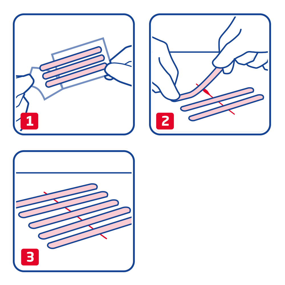 Leukoplast wound closure strips consist of a polyamide knitted fabric backing material coated on one side with an UV-curing acrylic adhesive. The rounded edges keep the strips in place, and the PET liner is perforated at both ends to simplify application. Leukoplast wound closure strip is sealed in printed pouches, packed into folding boxes and sterilized with ethyleneoxide.